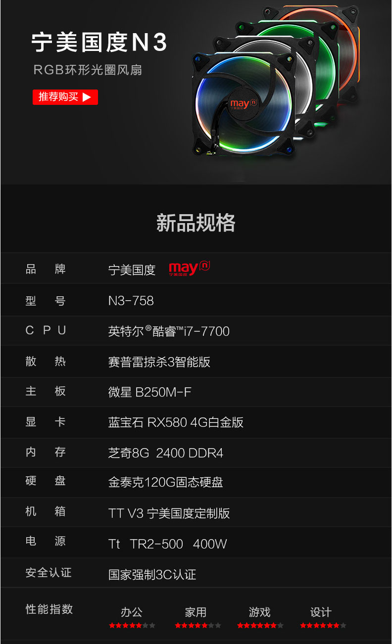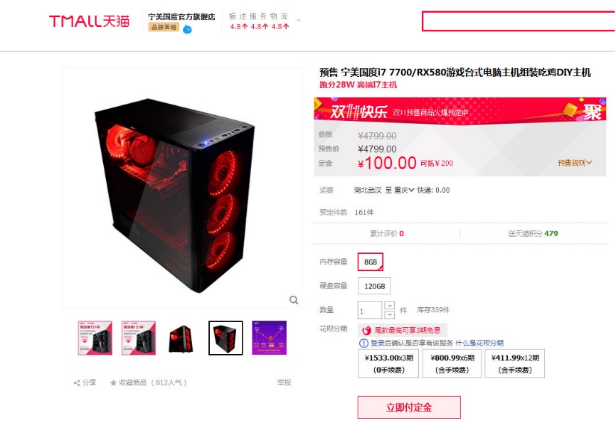 这款搭载了英特尔酷睿i7的主机全名称为:宁美国度i7 7700/RX580游戏台式电脑主机,售价为4899元,目前仅在天猫独家预售。