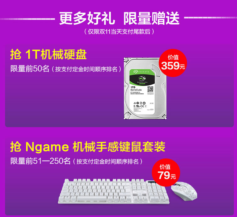 除此之外,宁美国度预售活动还将根据支付订金的时间顺序,为先支付的消费者的送出好礼。前50名支付订金的消费者将获得价值359元的1TB机械硬盘一块,前51名-250名支付的,将获得价值79元的Ngame机械手感键鼠套装一套。看准的朋友一定不要错过,赶快预定抢好礼吧。