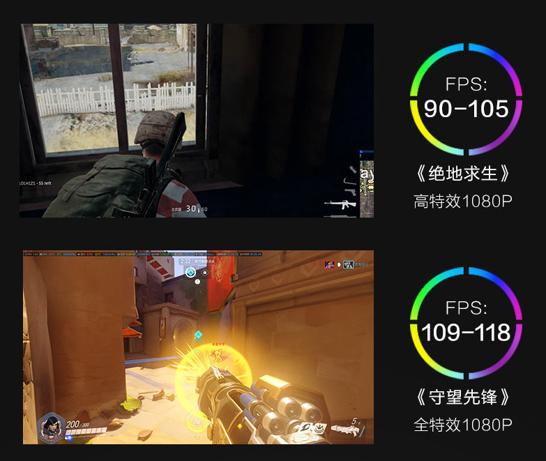 拥有i7和新一代蓝宝石RX 580 4G 白金版 OC 显卡的双重加持,宁美i7主机在主流游戏的帧数上显得更加稳定,是一款当之无愧的吃鸡主机。根据测试,吃鸡游戏《绝地求生》在高特效1080P的情况下FPS达到了90—105,而《守望先锋》在全特效1080P的情况下FPS也达到了109—118,基本拥有畅玩无忧的效果。