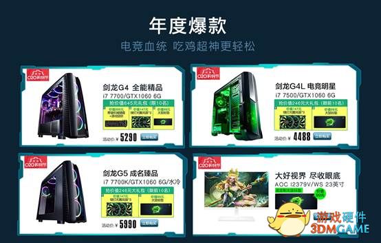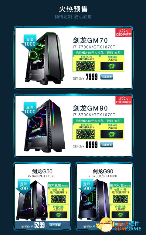 作为名龙堂旗下最亲民的电竞主机系列,本次活动拿出三款主打年度爆款:剑龙G4、剑龙G4L、剑龙G5。所有的机型全部标配了Intel四核处理器和GTX1060 6G显卡,性能足以胜任目前主流的大型3D游戏需要,《绝地求生》开启高画质运行流畅自如。现在购买还送机械键盘、LED散热风扇和鼠标垫等好礼,强烈推荐“吃鸡”玩家入手。