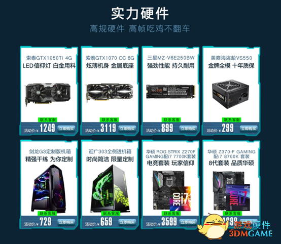 如果你是喜欢自己DIY硬件的游戏玩家,可以考虑名龙堂的精品硬件系列。包括显示器、显卡、机箱和CPU主板套装等在内多种多样,品类丰富。所有产品均来自如华硕、索泰、三星、海盗船等一线大厂精选,还有NVIDIA限量定制版机箱可选。高规格硬件可为你的主机更强劲的性能表现,畅享高帧率“吃鸡”的乐趣。