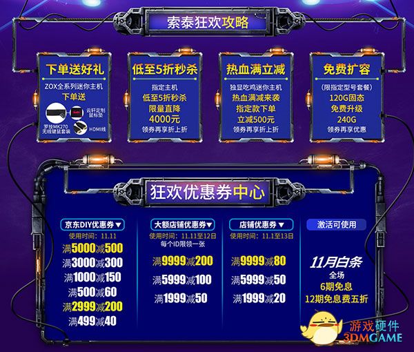 众所周知,双11如此诱人主要是因为那令人眼花缭乱的各种减免降价,如果是双重优惠已经让人很是心动,而今年双11,索泰携手京东云轩DIY整机专营店推出索泰ZBOX“双11无索不欢/无约束更自由”三重优惠活动,更是让广大玩家惊喜不已。
