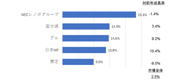根据市场调查机构 IDC 的数据显示 ,日本个人 PC 业务的前五名分别为:NEC 联想集团、富士通(Fujitsu)、戴尔、日本 HP 与 东芝Toshiba。其中第五名的 Toshiba 每年约可售出 180 万台电脑。