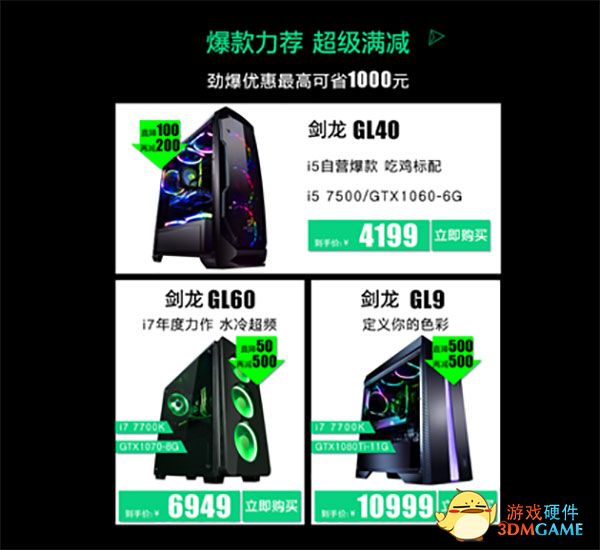 剑龙GL系列自推出就是深受游戏玩家的欢迎,在这次活动中,部分机型劲爆优惠,搭配优惠券可省高达千元。游戏利器剑龙GL40也在其中。搭载英特尔第七代酷睿处理器i5,它有着强大的处理能力和响应速度,无论工作娱乐,都能有出色的表现。并且还采用了 GTX 1060 显卡,全新帕斯卡架构6G大显存,游戏特效全开,让玩家体验到更加逼真的游戏画面。