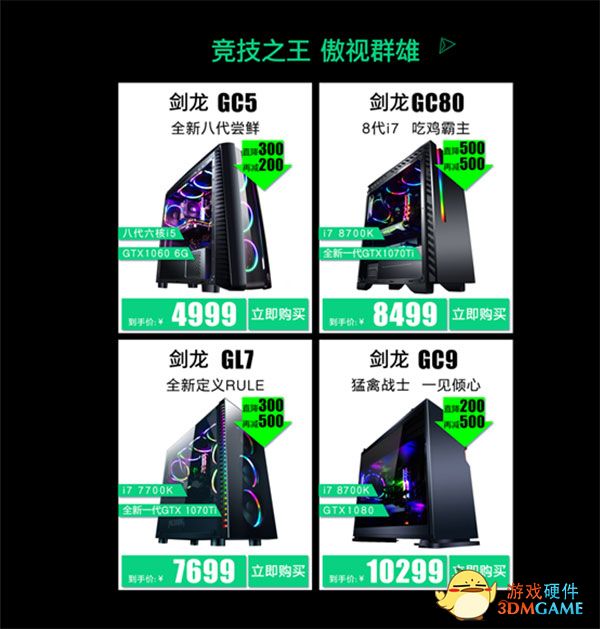 名龙堂这次也是诚意满满,不止是高端机型,就连入门机型也是直降再减。剑龙GC5适合给刚入门 的小白“尝尝鲜”。搭载第八代酷睿i5的它,配合技嘉的Z370芯片组带来的强悍的数据处理能力和响应速度,玩家可享受到超越前代的流畅惊艳的高清游戏。再加上来自影驰的GTX 1060骁将6GD5独立显卡,轻松运行大型游戏,畅爽游戏无压力。