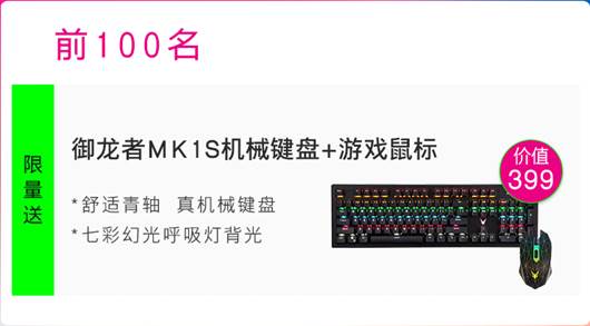 而且名龙堂还为该款机型限量升级240G SSD,让玩家获得更大容量SSD,兼顾系统文件和游戏安装的需要。前100名购买剑龙G4的玩家还将获赠御龙者MK1S机械键盘+游戏鼠标,带来酷炫的七彩幻光呼吸灯特效以及舒适地青轴敲击手感,使游戏操作更加行云流水。