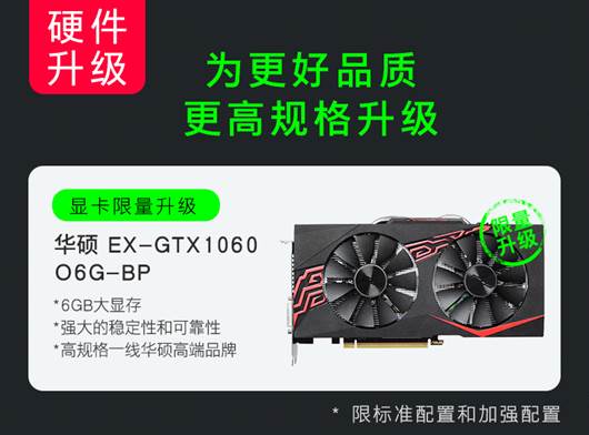 名龙堂一贯坚持高标准的硬件组 合。在活动期间,名龙堂剑龙G4与G5显卡均提供限量升级品牌服务,从原有显卡配置替换为华硕高端GTX 1060显卡,为玩家带来更具稳定性和可靠性的品质之选。