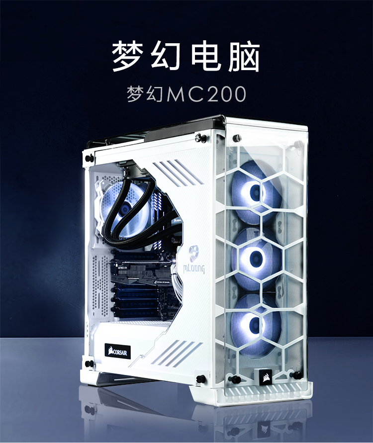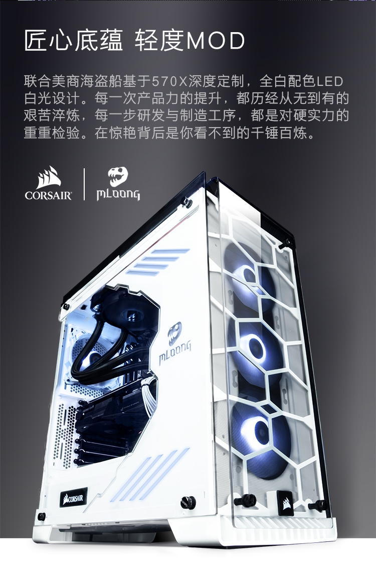 暴龙MC200在外观上以黑白为设计元素,高贵典雅,侧透式设计让机箱内部结构一览无遗。联合美商海盗船基于570X深度定制,全白配色LED白光设计,视觉上更加惊艳。