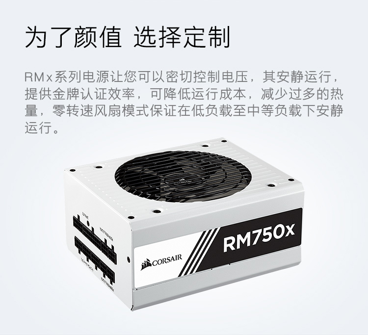 电源使用海盗船RMx系列电源,80PLUS金牌认证,操作效率高,发热少,并使用全日系电容,优质的用料保证稳定的输出和可靠性。中、低负载时风扇零转速,让你获得更安静的环境。全白的模组线材,保证了整体的美观。