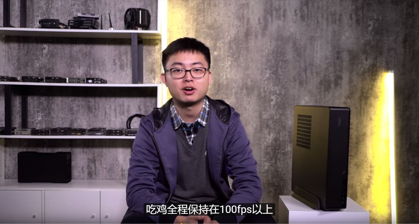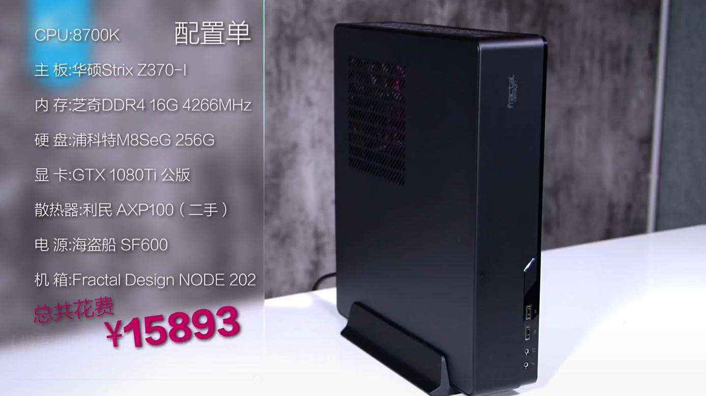 在他旁边的是一个容量为10.2升的一个ITX机箱,往里配入,“华硕Strix Z370-I、Intel i7-8700K、公版的1080 Ti、双通道芝奇DDR4 16GB 4266MHz、浦科特M8SeG 256G硬盘 海盗船SF600电源”总价为15893元。