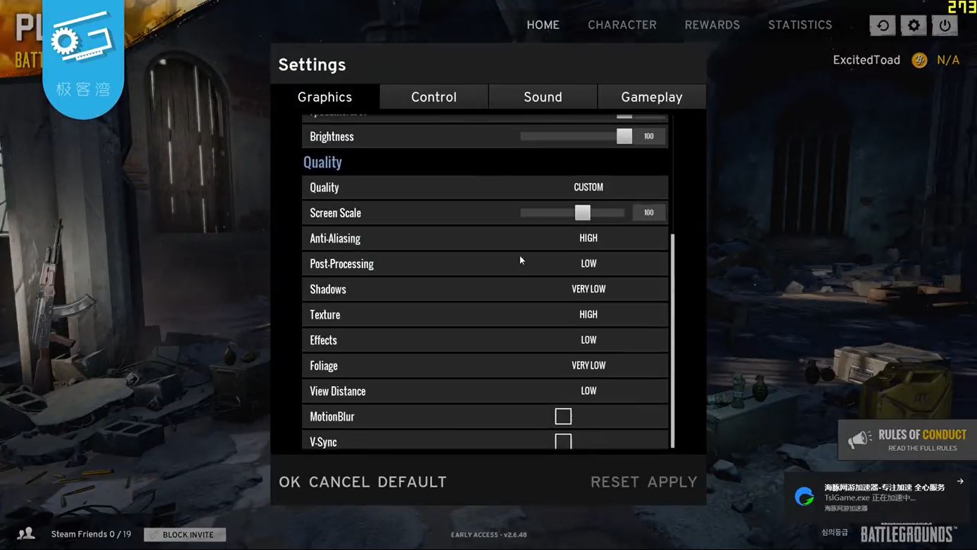 刚一进入游戏,在客户端平台就已经达到了273帧左右,将测试1080P的画质在游戏中帧数是多少?其中关闭垂直同步以及限制画面帧数的选择项,将抗锯齿以及贴图纹理都采用了“高”,而其他后期处理、特效以及视距采用了“低”,人物阴影和植物阴影都采用“非常低”。(PS:以上特效设置,跟随主播推荐来选择,据说更容易看见敌人)