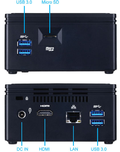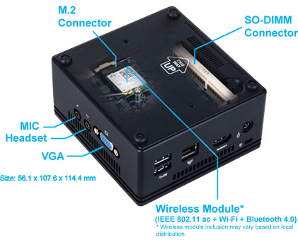 其他配置方面,内建1个 6Gbps SATA3接口,支持安装1个厚度7.0/9.5mm 2.5寸硬盘,内建1组SO-DIMM DDR3L插槽(1066/1600 MHz),内建 PCIe M.2 NGFF 2230规格的扩展卡槽(可扩展WiFi+蓝牙扩展卡,扩展后可以支持802.11ac Wi-Fi、蓝牙4.0),内建VGA和HDMI显示接口,可支持双屏幕输出,内建Micro SD卡槽,内建千兆高速网卡,内建3.5mm耳机和麦克风音效插孔,包装附赠符合VESA规范的固定架,可将它轻易隐藏安装屏幕背后。