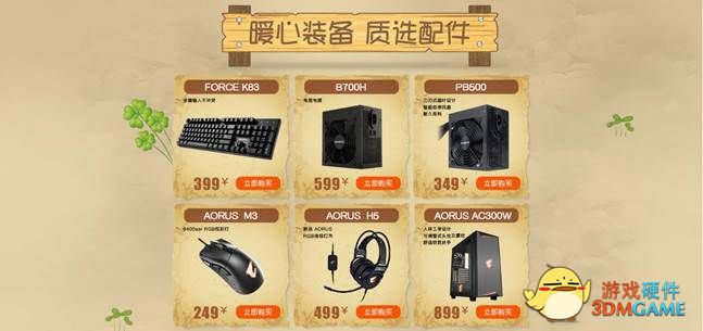 追求精品的同学们,打造一套全AORUS系列产品的电竞主机,一定要抓紧这次机会。在本次活动的配件及周边精选区,包括AORUS M3鼠标、AORUS H5耳机、AORUS AC300W机箱等,硬件游戏周边配备全部到位,实现你的AORUS电竞梦。