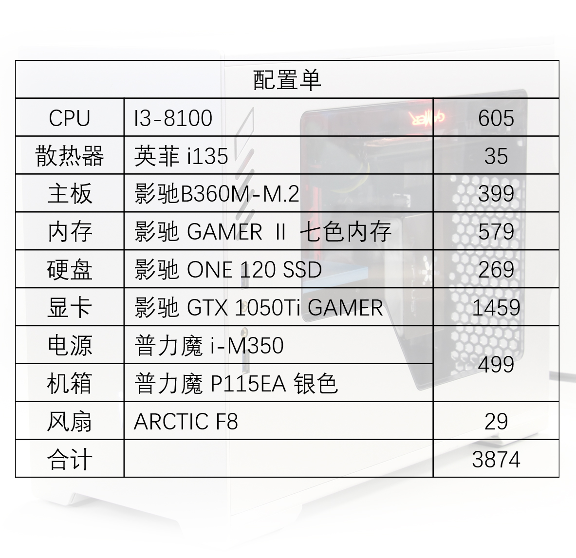 由于平时主玩传奇私服和英雄联盟,只在周末和好基友组队吃鸡,所以对电脑性能的需求并不太高。而且老婆大人给的预算只有4000元,不敢追求太多酷炫装备,所以本次装机只能低调低调再低调。 装机配置单如上,一水的廉价货。除了影驰GTX 1050Ti GAMER显卡的顶部LOGO灯,也只有内存能够陪我闪闪发光了。 一脸懵逼的CPU,被同事拿去做了开盖实验,不知道它还能不能活着点亮。 35元的英菲i135,冲着外观买的,性能有待测试。 影驰B360M-M.2主板,提供2个USB 2.0接口,2个USB 3.0接口,2个USB 3.1接口,足以满足外设狂热分子的需求。 板载M.2接口支持PCI-E 3.0×4 NVMe协议及SATA3标准的M.2 SSD,不过我这次用的是2.5寸SSD,这个接口暂时跟我没关系。 内存是影驰 GAMER Ⅱ 七色内存,相较于上一代除了外观做了颠覆设计,灯光也由单色变成了七色跳变。 橙色散热装甲依然十分抢眼,金属质感拿在手上非常舒服。 硬盘是影驰 ONE 120 SSD,浅蓝色外盒一见倾心。 120G容量用于安装系统和两三款游戏刚好合适,其他影音文件还需要另外加装机械硬盘。 显卡不用多做介绍,影驰 GTX 1050Ti GAMER,4GB显存玩英雄联盟和传奇绰绰有余,双风扇也给散热提供了足够的保障。 显卡顶部自带RGB灯效,可通过影驰魔盘进行自由调节。 机箱和电源是从普力魔自营店买的套装,电源额定350W足够使用。 在后面的测试中发现,电源风扇噪音很大,不得已只能将自带的风扇拆除,改装自购的8cm Arctic 4Pin小风扇。 虽然换的新风扇厚了一点,好在不影响安装。4Pin接口可以插在主板上进行转速调节,也免去了噪音的烦恼。 普力魔P115EA机箱,虽然体积小,但内部空间设计合理。可容纳M-ATX主板和305mm显卡,最难得的是还支持背部走线。 我购买的银色版本线条简约硬朗,即使是和显示器一起放在桌面也不显多余。 一顿操作之后,机器成功点亮,我还需要进行一些测试检验主机是否可以长时间运作。 系统很快安装完毕,以上是从CPU-Z看到的基础信息。 当前室温26℃左右,CPU待机温度34℃。 使用AIDA64软件进行系统稳定性测试,10钟测试结束,CPU温度一直稳定在60℃以下。 接下来是显卡测试环节,显卡待机30℃,很稳当! 甜甜圈测试中,显卡温度最后稳定在了70℃,用手触摸机箱可以感觉到明显的热度。建议还是在机箱尾部加装2个8cm散热风扇,前置一颗进风风扇仍不足以完全排出显卡热量。 鲁大师跑分当然少不了,17万分多一点。发现没有点亮吃鸡图标,好奇的我点进去看了一眼…… 给了我一个这样的结论,难道120G固态就不配吃鸡吗?当然,没必要和一个测试软件较真。我还是选择进入游戏亲身感受一把。 在开启游戏加加后,我进行了1080P分辨率下超高、高、中三种画质的测试。可以看到,虽然超高画质下平均帧数只有44帧,但在高画质和中画质测试中,我的主机还是达到了60帧左右, 在B360主板上市以后,8100又成为了新一代装机神U。伴随着内存和显卡价格的降温,装一台入门级的吃鸡主机已不需要过多花费。如果你等不及2000系显卡上市,现在买一片影驰GTX 1050Ti级别的显卡也足够使用。多的不说,我98K贼溜! 京ICP备14006952号-1 京B2-20201630 京网文(2016)1650-207号 沪公网安备 31011202006753号未成年人举报:[email protected]