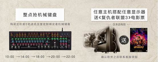 在指定整点时间下单,玩家还将有机会获得名龙堂定制御龙者机械键盘。任意主机搭配任意显示器一齐购买名龙堂还将赠送5月11日上映的《复仇者联盟3》电影票,更多好礼尽在名龙堂。