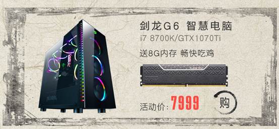 作为名龙堂的热门吃鸡主机,剑龙G6成为很多鸡友的理想之选。该款主机采用i7-8700K+GTX 1070Ti的配置,高清画质玩吃鸡不在话下,将提供充足的火力,让玩家在《绝地求生》中尽情征战。这次名龙堂还将内存升级至16G,任务多开也无所畏惧,游戏翻车?不存在的。