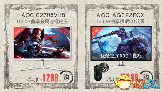 对于电竞游戏玩家来说,好的色彩和屏幕响应速度能帮助你更快的发现躲在暗处的敌人,从而掌控战场优势。如果你就是一个喜欢“吃鸡”这样的FPS爱好者,不妨考虑一下本次名龙堂活动的显示器特惠推荐。其中这款AOC AG322FCX的性能十分亮眼,具有144Hz +31.5英寸大屏幕的特性,相比传统显示器刷新率提高了240%,能减少游戏画面撕裂感,大幅度提升用户的游戏体验!而31.5英寸1800R的曲面视觉更显震撼,无论是游戏、电影还是办公都非常合适。现在购买还将有机会获得价值169蝰蛇2000DPI鼠标。如此超值玩家大可尽情剁手。