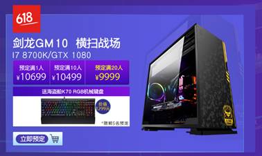 在高端主机专场,名龙堂还为大家准备了剑龙GM10,主板采用来自华硕的Z370-DRAGON,配合来自影驰的GTX 1080显卡以及16G内存,让主机有着不俗的3D渲染技术以及卓越的读写速度,非常适合各位游戏发烧友。当预定满20人时,主机仅需9999元就能入手,前5名预订者还将获得使用原厂cherry轴的海盗船K70 RGB机械键盘,好手感加持,让操作更加得心应手。