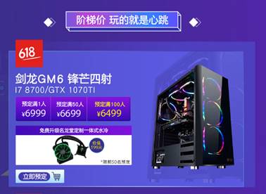 此次活动最大的亮点就是阶梯价:即整机的价格会随着预约的人数的增加而递减。以剑龙GM6为例,当预约满100人时将立减400元,仅需6499就能到手。剑龙GM6的实力也不容小觑,它选用采用i7-8700+GTX 1070Ti的配置,能满足时下大多数热门游戏的要求,提供流畅的游戏体验。前50名预定的朋友,名龙堂还会将散热免费升级为一体式水冷,相对起风冷散热更加优秀,即使运行多个应用程序是有效保持低温和降噪。