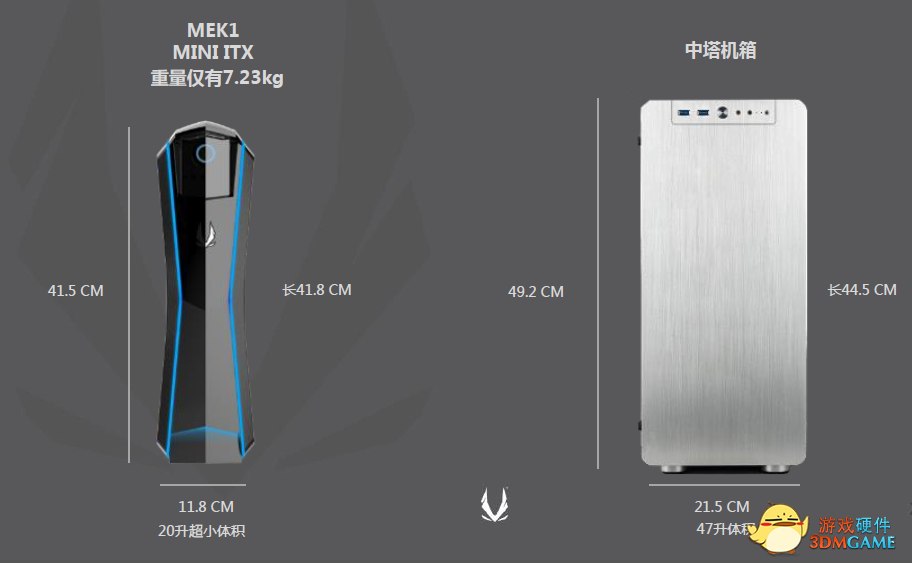 与普通的中塔主机相比,麦克MEK1的大小不到一半,与全塔机箱相比,体积甚至不足1/3,且索泰麦克MEK1的重量也非常的轻盈,整个主机的重量仅7.23KG,一只手就可以提着走。摆放起来不占用太多空间,搬运也更加的轻松便捷。