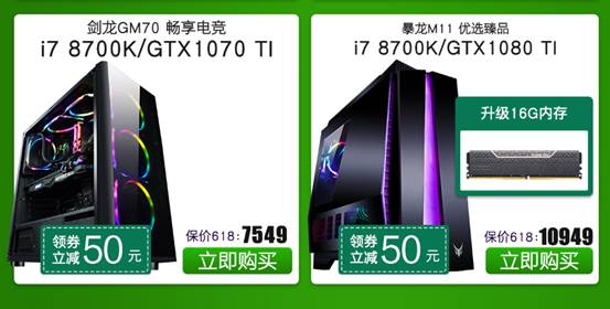在高端主机会场上,这款暴龙M11无论从颜值还是性能都能满足发烧友的要求。主机机箱上安装了炫彩呼吸灯,玩家可自由定制颜色以及循环模式,打造专属于自己的炫酷个性装备。配置上暴龙M11采用i7-8700K+GTX 1080Ti的强劲组合,轻松碾压任何大型单机游戏。为了让玩家游戏更尽兴,每天前20名购买暴龙M11的玩家,名龙堂将原8G内存限量升级至16G,大内存加持,让游戏体验大幅提升。