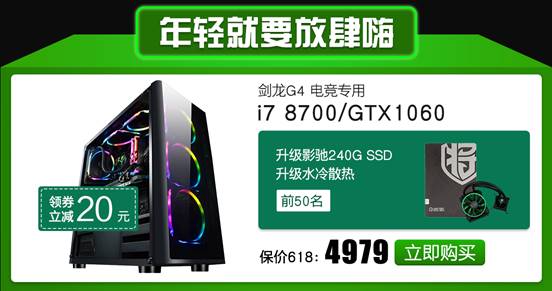 作为一款吃鸡利器,剑龙G4以其不凡的实力深受广大鸡友的喜爱。主机选用i7-8700+GTX 1060的配置,完全满足流畅运行《绝地求生》的要求。对于前50名购买剑龙G4的朋友,名龙堂还将免费将主机硬盘升级为来自影驰铁甲战将240G大容量固态硬盘;每日前五名购买者名龙堂还将升级选用一体式水冷,让主机的战斗力直线飙升。