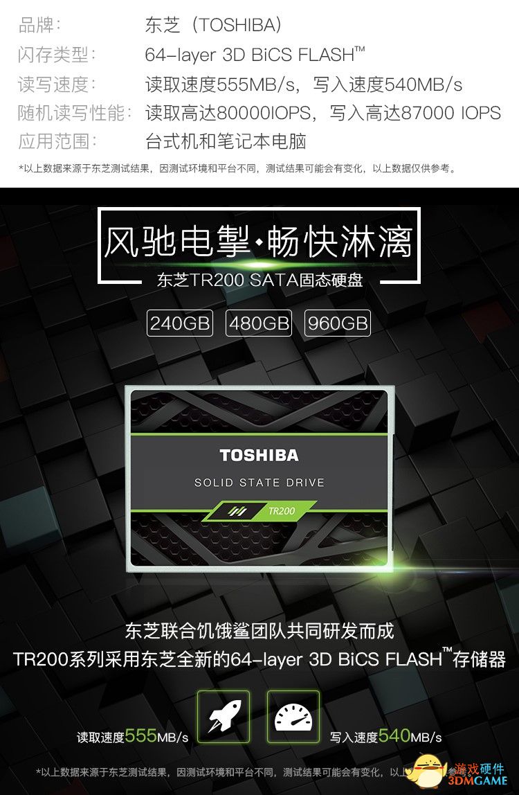东芝 TR200 SSD 固态硬盘240G读取速度达到555MB/s,写入速度540MB/s。