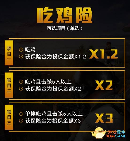 在8月23日至9月1日,购买名龙堂剑龙G6主机的朋友可参与投保“吃鸡险”,一共提供三种不同的套餐供大家选择,详见下图。下单且付款即为吃鸡险投保成功,投保金额默认为1元,上限为100元,投多少元就拍多少件,单排吃鸡且击杀5人以上最高可获得三倍保险金。