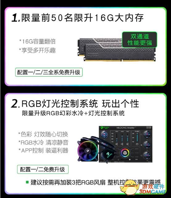 不仅如此,名龙堂还将为前50名购买剑龙G6的玩家升级内存至16G ,DDR4 2400优化了频率和时序的配合,更大限度减少蓝屏死机,吃鸡更安心。而双通道的组合让玩家在游戏中告别卡顿掉帧,大大提升游戏体验。对于购买配置一或者配置二的玩家还将限量升级RGB CPU水冷散热器以及灯光控制系统,不仅清凉静音,而且色彩以通过电脑和手机APP随心掌控,让主机轻松玩出个性。