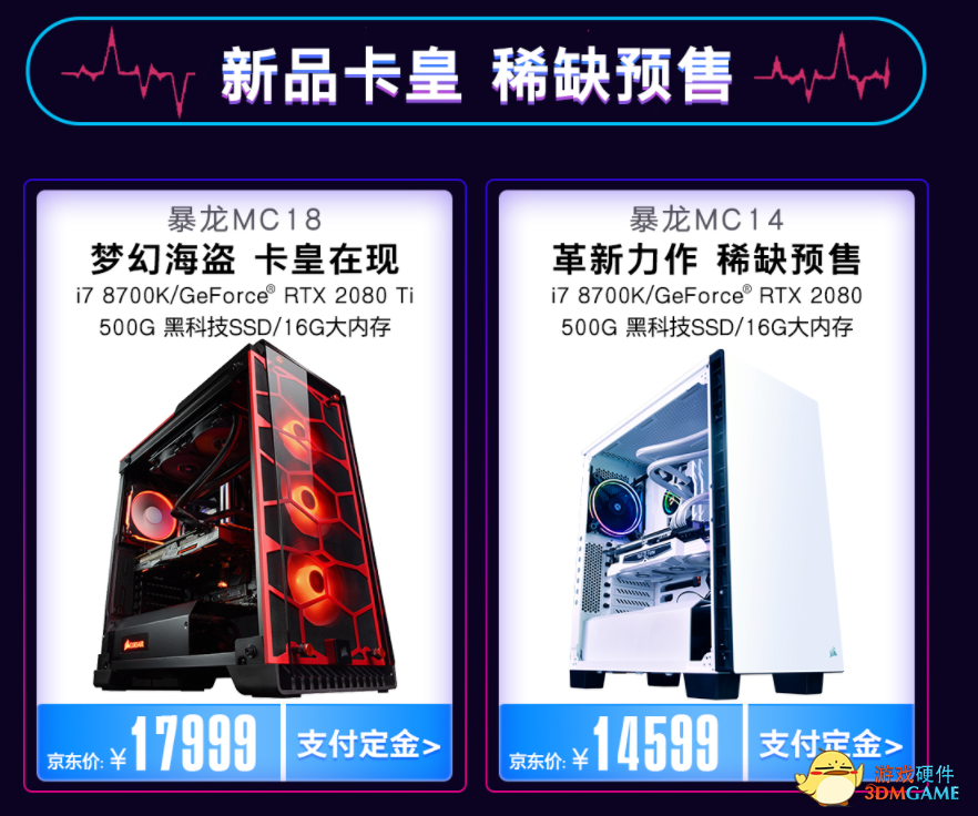 名龙堂这次还发布了两款搭载RTX 20系显卡的主机并且开启预售。其中暴龙MC18配备了最新卡皇Geforce RTX 2080Ti,搭配英特尔酷睿i7-8700K处理器,旗舰级组合性能简直不要“Ti”强悍,除此之外主机还配备16G内存以及高速NVMe M.2,尽享数据高速传输所带来的游戏快感。