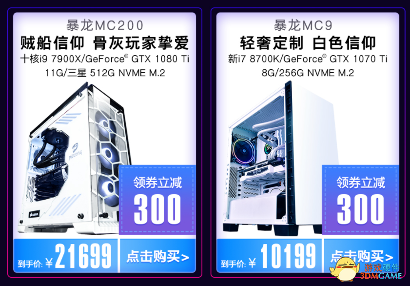 在高端主机专场,名龙堂派出了暴龙MC200作为代表,以黑白为设计元素,简约但不简单。配置方面采用英特尔酷睿i9-7900X处理器,强大的10内核20线程,配合Geforce GTX 1080Ti显卡,性能上乘,横扫市面上所有热门大型游戏,带来沉浸式的游戏体验。现在这款主机领券到手价仅需21699元,为信仰而充值刻不容缓!