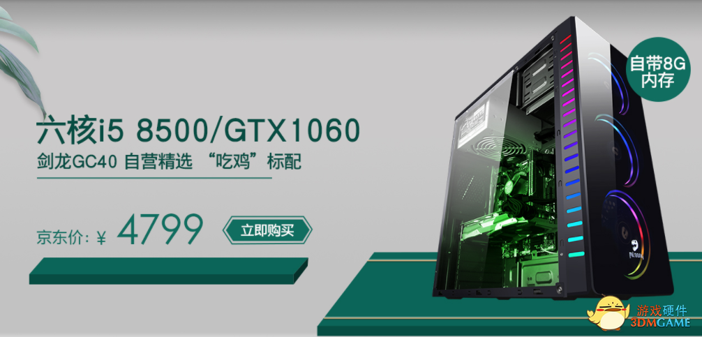 作为名龙堂的爆款主机,剑龙GC40凭借优异的配置以及超高的性价比,深受一众“鸡友”的喜爱。剑龙GC40采用i5 8500处理器,搭配 GeForce GTX 1060,满足流畅玩《绝地求生》的要求,另外还配有128G NVMe M.2硬盘,带来瞬秒数据传输的体验,快速开启吃鸡之旅。现在活动到手价不到5000,喜欢就赶紧下手吧。