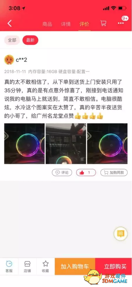 看样子客户还是非常满意这个速度的,居然用了“恐怖”这两个字来形容名龙堂的送货速度。这套主机的外观特别酷炫,“内心”也因为RGB炫彩风扇的加持而格外绚丽多姿,更更更重要的是性能也能够满足客户的游戏需求。