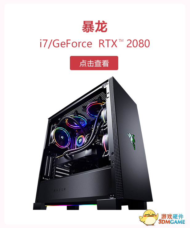 作为高端机的代表,名龙堂暴龙主机可谓当仁不让,而且本次更是联合高端电竞外设厂商雷蛇一同打造主机,旨在满足高端信仰玩家的需要。首先主机核心配置为i7-9700K+RTX 2080组合,轻松玩转各类3A大作,其次主机搭配16G DDR4内存与500G NVME SSD,给玩家带来真正的电竞体验。另外无灯不电竞,无灯不雷蛇,名龙堂与雷蛇一同打造专属信仰机箱,机箱正面拥有雷蛇信仰logo,底部更有幻彩底光灯条,配合名龙堂众多RGB风扇,玩家可充分感受RGB光污染的魅力。