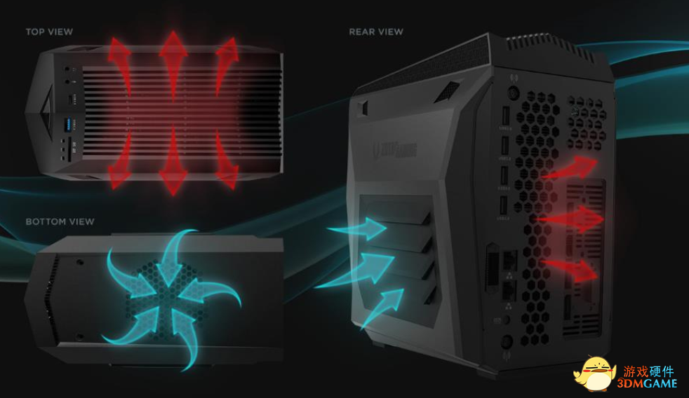 迷你主机散热是一大难题,尤其是集成了那么多高端硬件的索泰麦克MEK MINI电竞主机,索泰在散热方面下足了功夫,将机箱的散热口巧妙的融合在了6个平面上。