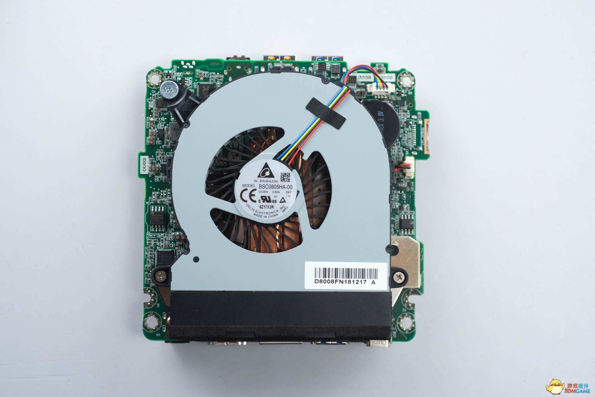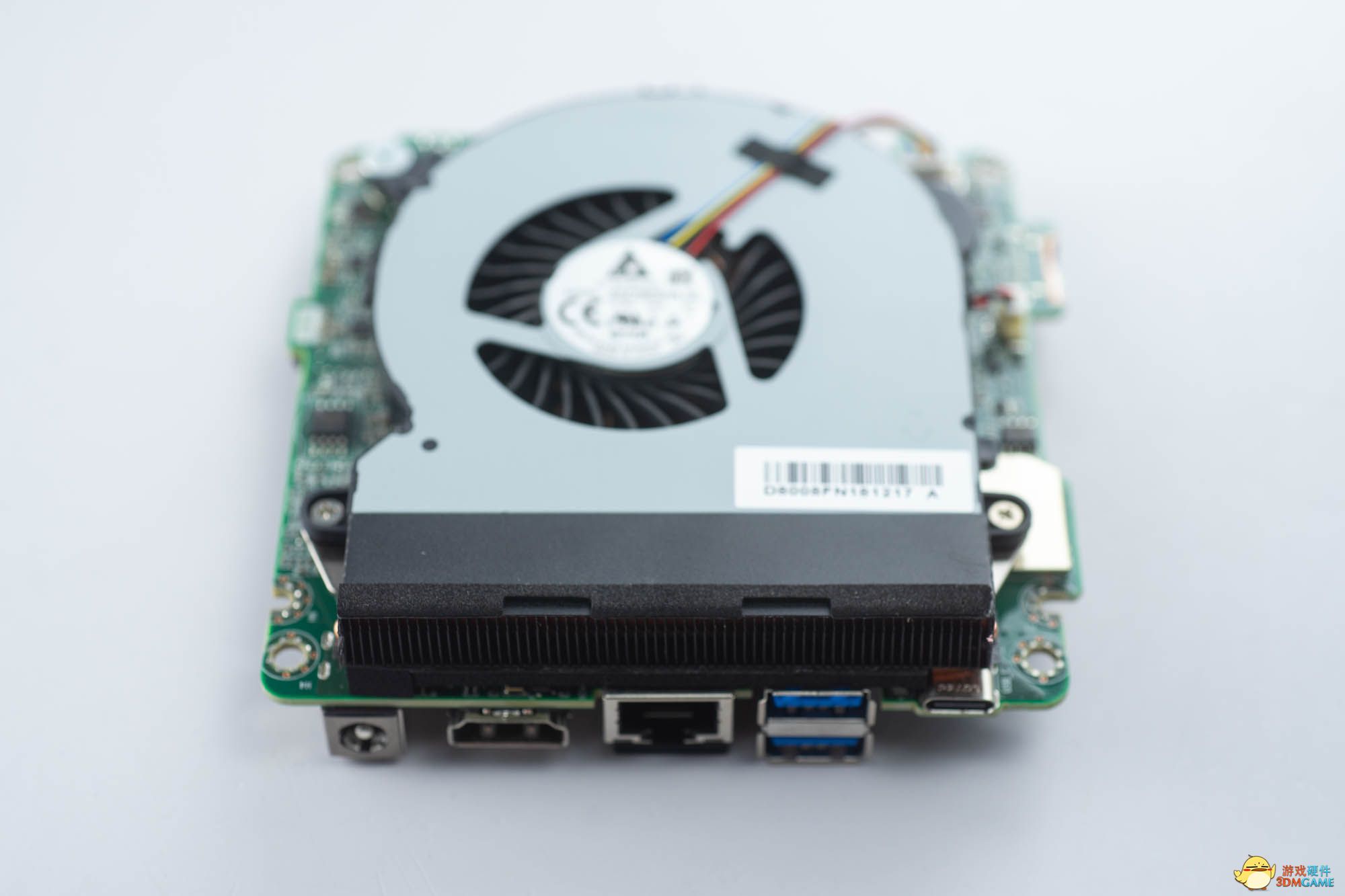 主板另一面就是CPU所在的位置,首先可以看到一个超薄的风扇,因为NUC使用的是Intel Core平台的低压处理器而非Core M,所以主动散热也是必须的。