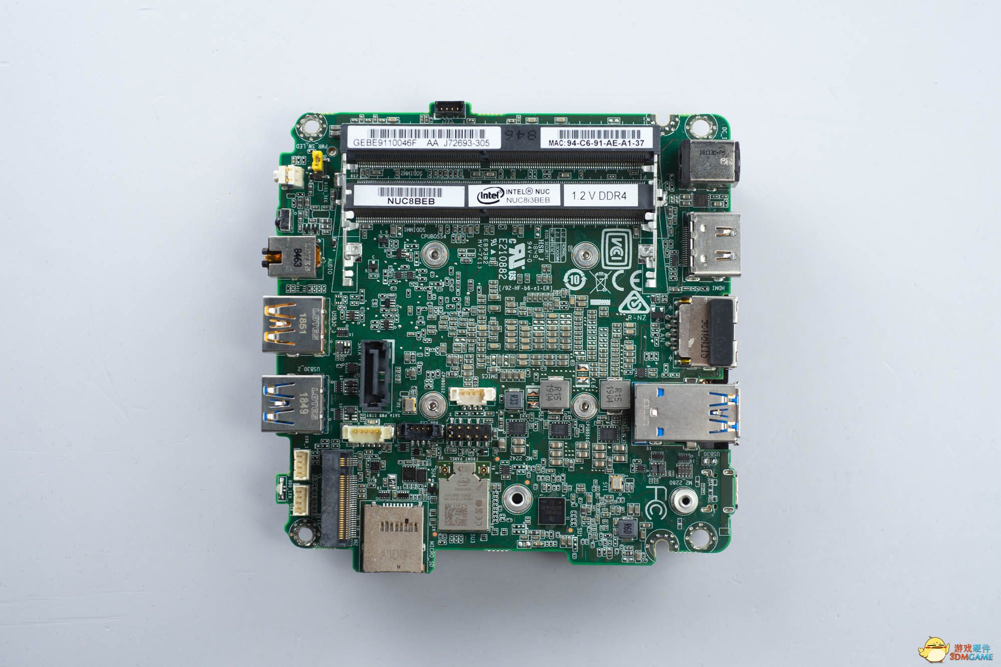 为了最大程度的缩减主板面积,NUC采用了双面主板的设计,拆开底盖后的一面提供了两个内存插槽,支持双通道32GB,使用的是笔记本上采用的1.2V低压内存,最高可以用到DDR4-2400规格。