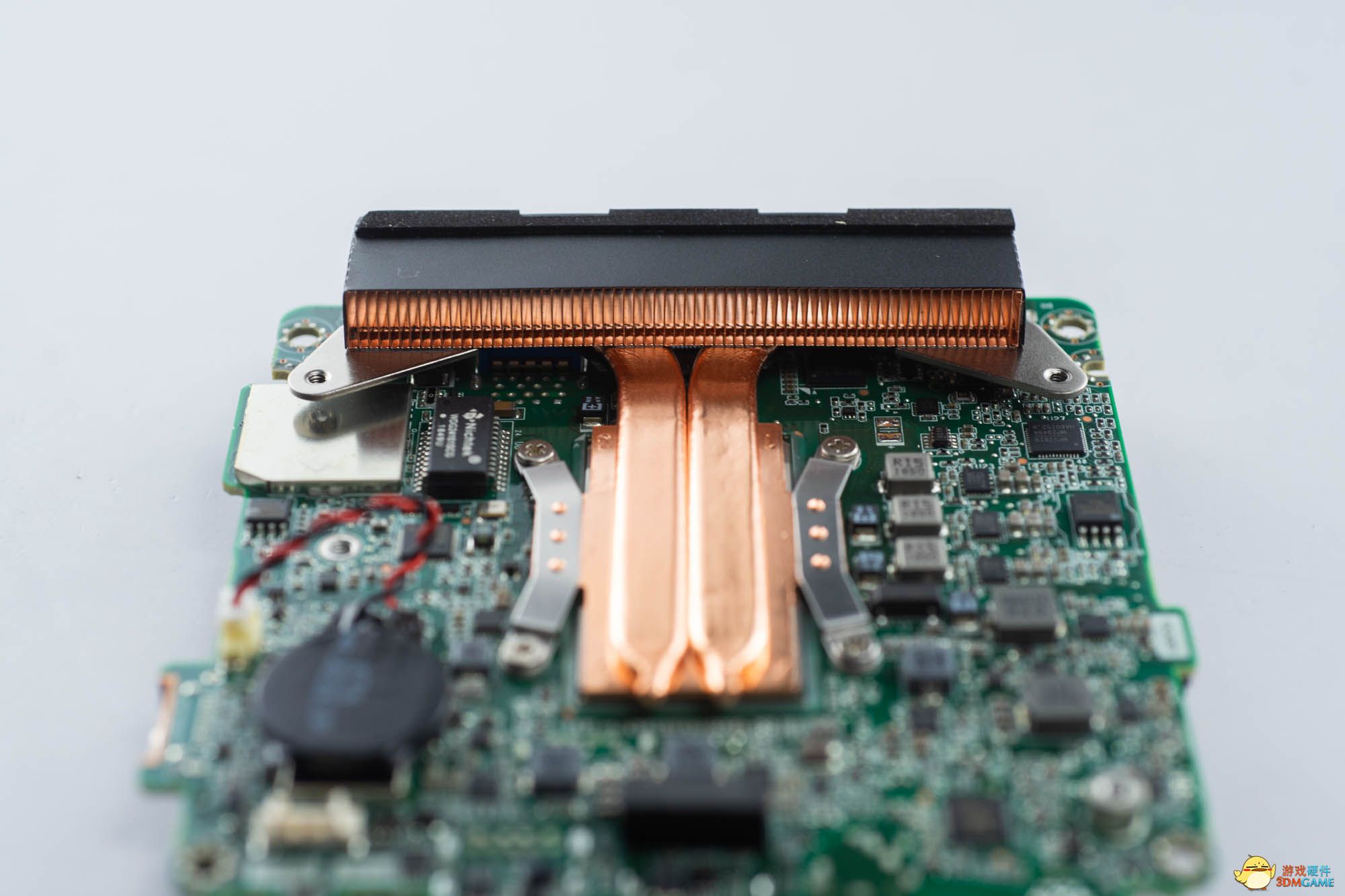 拆下风扇可以看到CPU部分使用了两根热管的散热方案,单风扇+双热管用于压制这颗TDP只有28W的i3-8109U已经是足够了,事实上这个散热方案甚至比MBA上那梦幻但热管还更好一些。