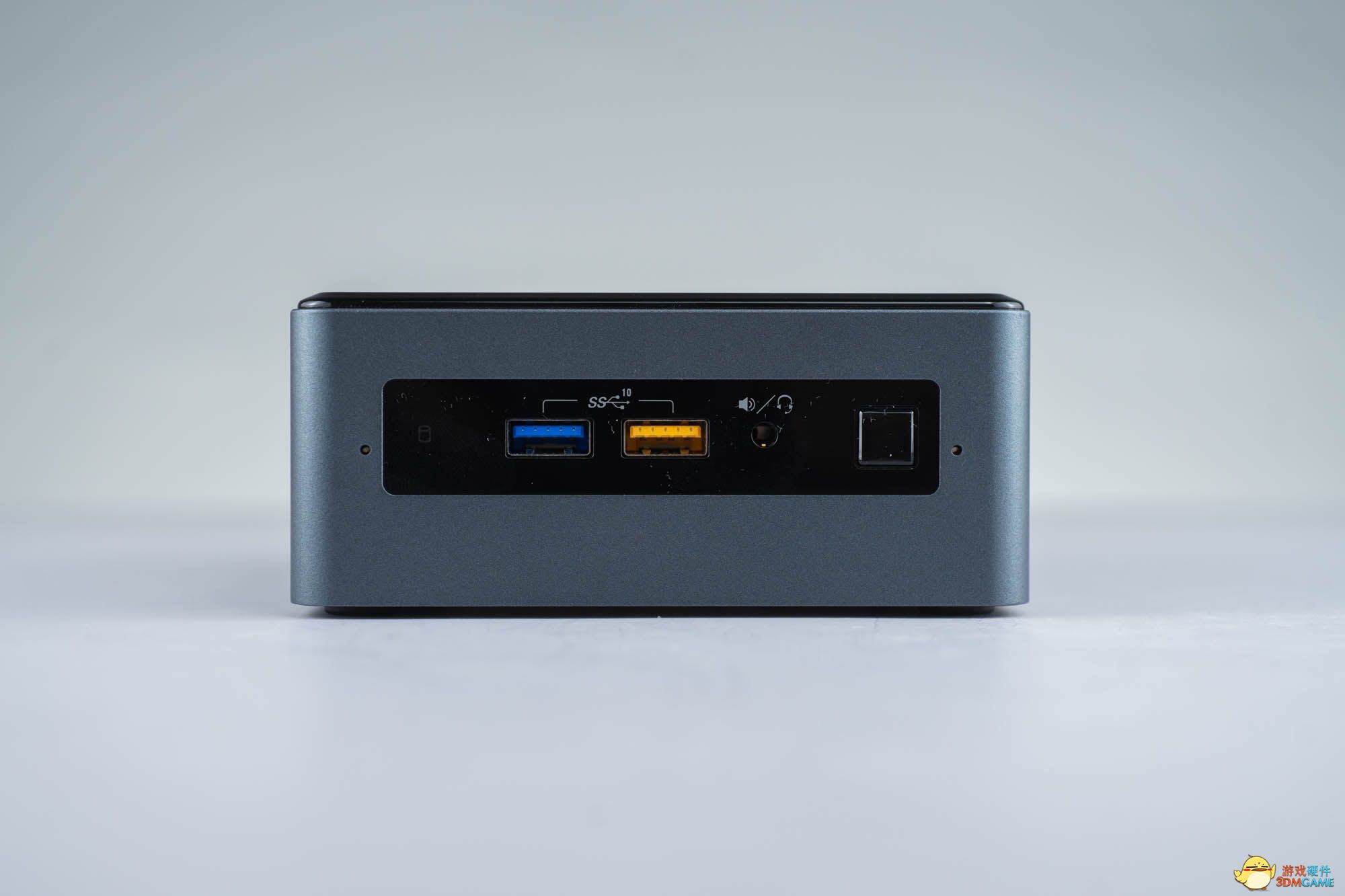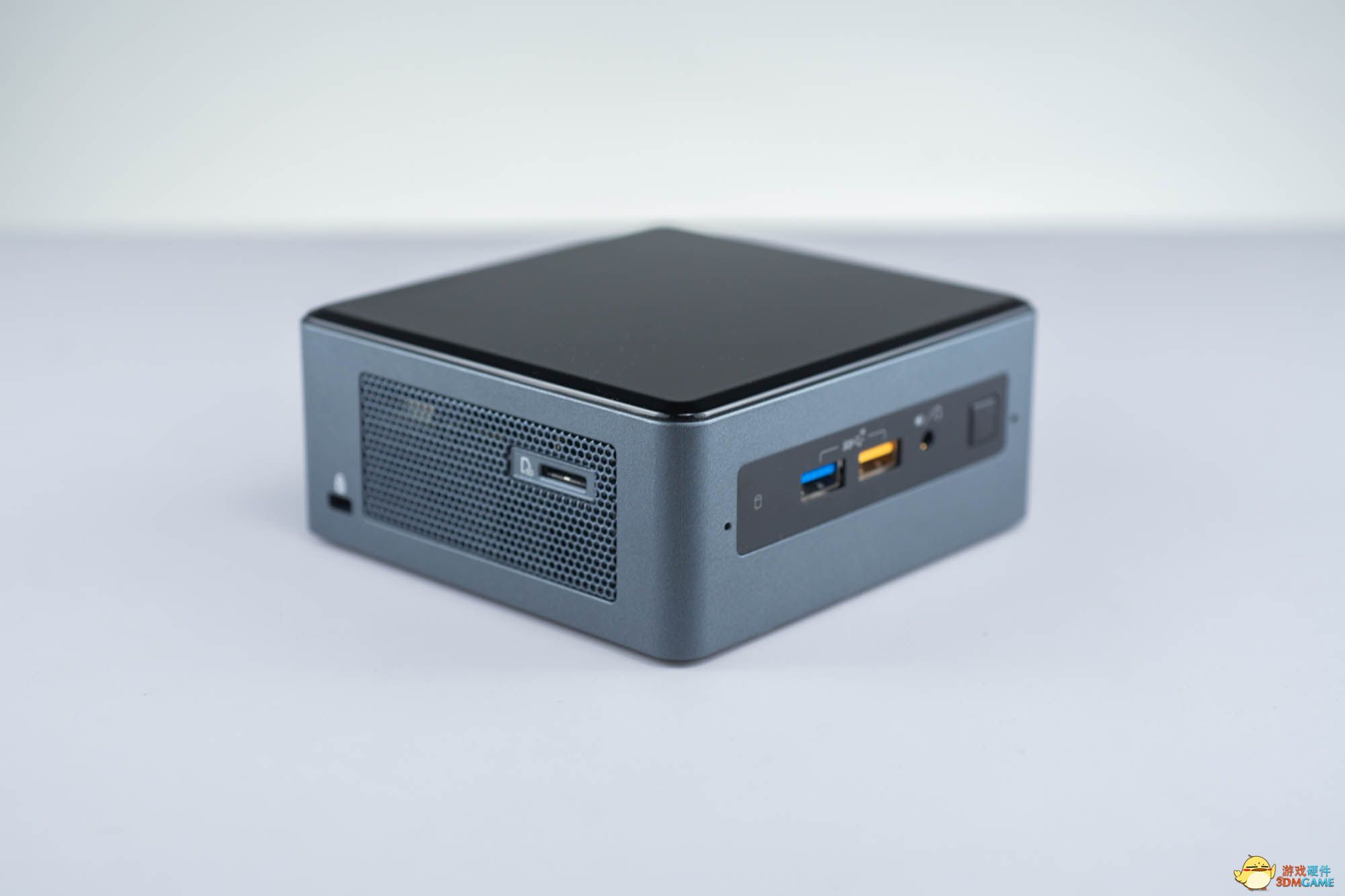 NUC这款产品外形是一个非常小巧的盒子,体积只有0.7L,“巴掌大小”是一个毫不夸张的形容词。整机造型简单大方,顶盖通过卡扣形式和主机相连,支持自定义。