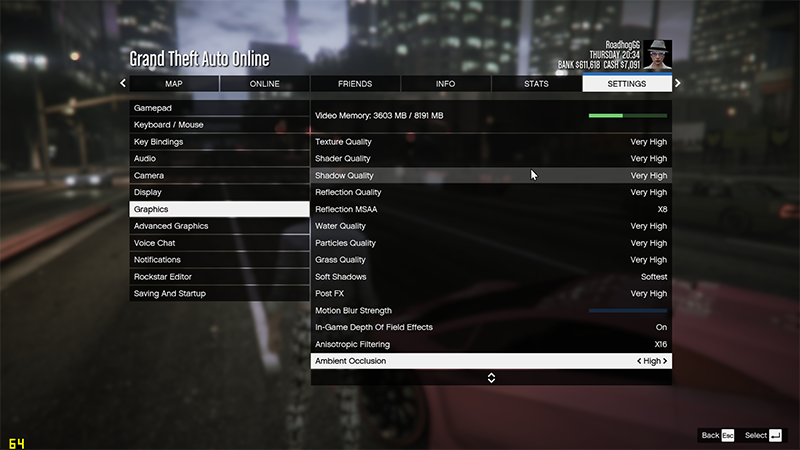 帧数方面整体跨度较大,在分红关银行里帧数还算较高,但飚车时帧数就明显下降,不过整体帧数还是能够保持在60帧左右,不过作为一个研究过GTA5画质设置的玩家忠告各位,尽管电脑配置够高,但在游戏时还是关掉长阴影(高解析度阴影)并调低抗锯齿,这样在游戏时帧数会提升很多。