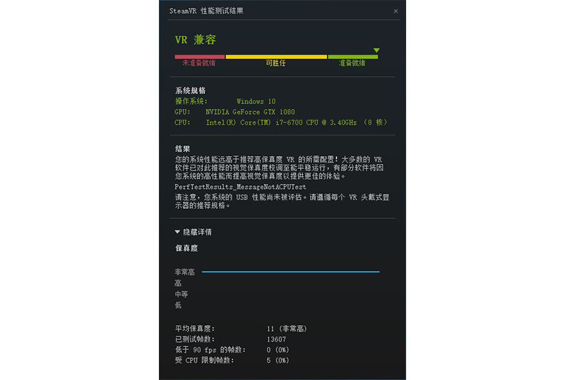 在这台电脑上运行VR可以保证全程90以上的FPS,这个帧数对于流畅体验VR至关重要,而保真度也达到了11,在VR兼容结果中也达到了“准备就绪”的最高值。