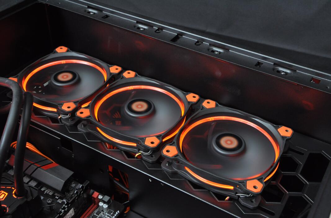 风扇采用了业界知名品牌Thermaltake风扇,配有橙色光圈的Tt风扇为整台PC增加了不少颜值,而且这款风扇在静音方面控制的十分到位,即使打开侧透板也基本听不到风扇的声音。
