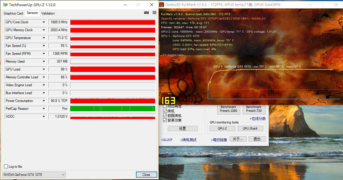 可以看到显卡默频情况下甜甜圈拷机15分钟后显卡温度稳定在了71℃,不过这仅仅是安装了三个机箱风扇的情况,如果所有风扇加满组建更合理的风道,温度还可能会更低,因此散热能力还是值得肯定的。