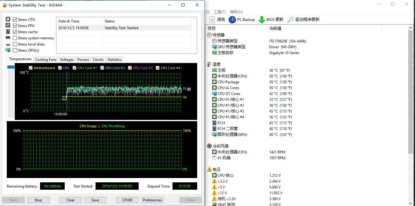 接下来笔者用AIDA 64测试了一番CPU稳定性,虽然AIDA64压力测试属于较轻量级别,但用来测试散热能力以及默频稳定性是足够的,经过十五分钟的测试后,CPU核心温度仅有59℃,而温度曲线也十分稳定,没有出现过大幅度波动的情况,所以说剑龙G7留给我们的超频空间还是很大的。
