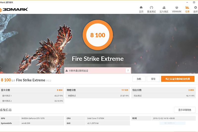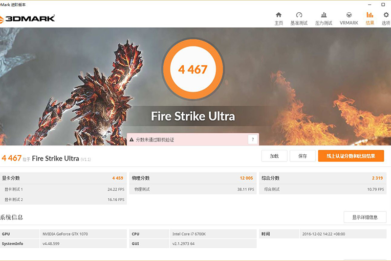 而到了4K分辨率的Fire Strike Ultra,4467的成绩比之前GTX 1070测试时的成绩还要高出300分,也就是说剑龙G7的平台综合性能比笔者评测GTX 1070时使用同样搭载i7-6700K的测试平台性能还要更高一些。