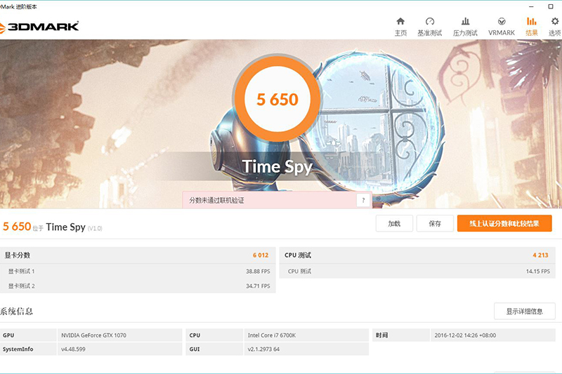 Time Spy是3DMark专门针对DX12所推出的测试工具,通过测试后,剑龙G7得到了5650的分数,再一次证明了微星红龙的实力。