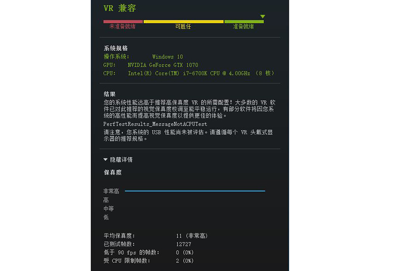 笔者使用Steam VR测试软件SteamVR Performance Test进行测试,可以看到剑龙G7全程保持在VR流畅标准90帧以上,VR兼容结果也显示了“准备就绪”最高值。