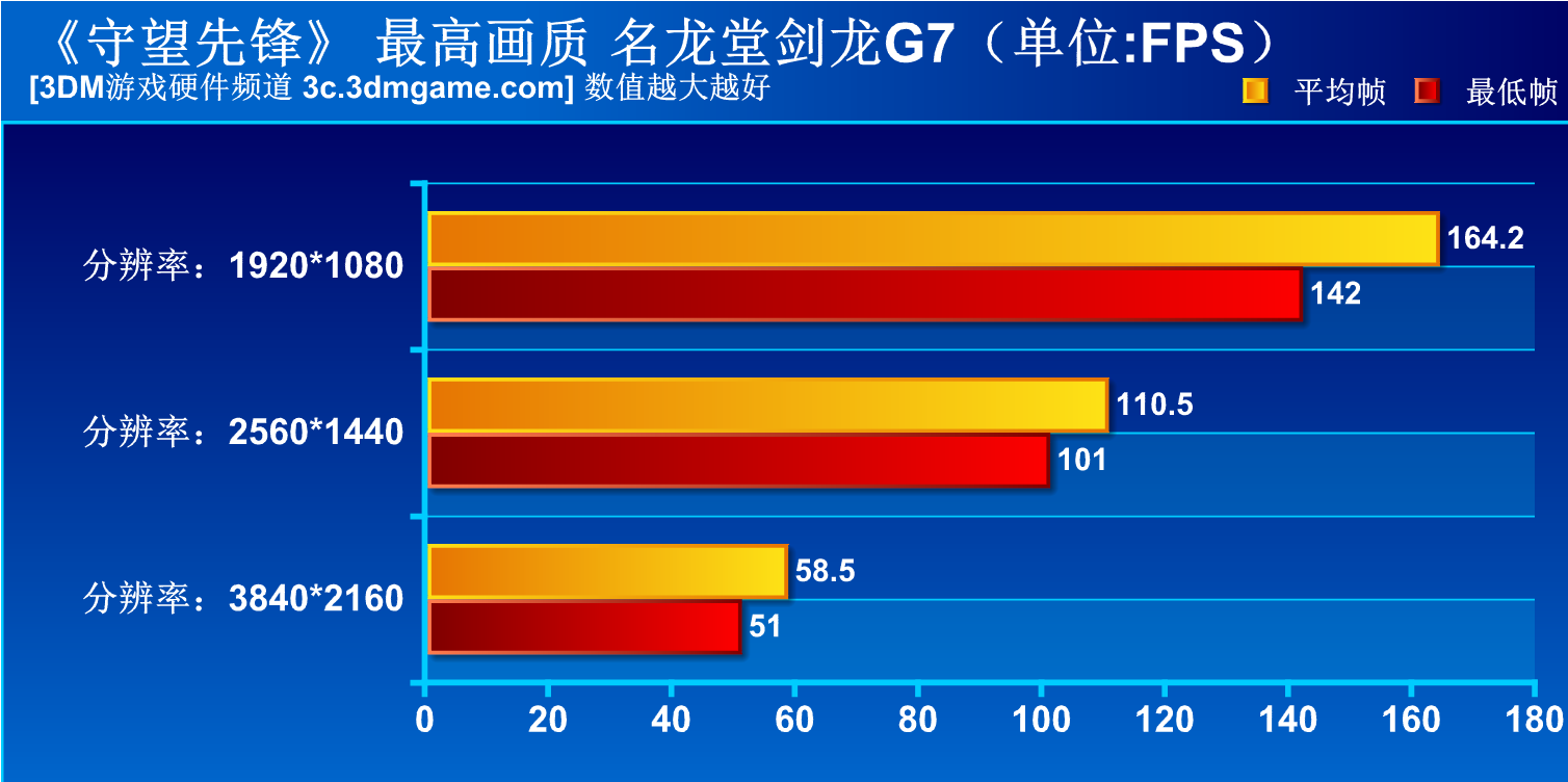 毫无疑问玩《守望先锋》完全不需要高分辨率,作为FPS玩家的笔者,我只想要更高更稳定的帧数表现,并且要保证游戏任何时间都不会出现卡顿,显然名龙堂G7做到了,最低142的帧数并不会浪费你的144电竞显示器,更高的分辨率只作为参考,实际意义不大。