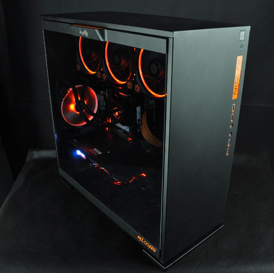 上面也提到了定制机箱,用过迎广303这款机箱的玩家应该知道,前面板USB开关包括3.5mm插孔都会发出蓝色的灯光,而为了配合剑龙G7的黑橙配色,名龙堂定制后的迎广303所有灯光包括侧透板拉手部分变成了橙色。侧透板底部也有名龙堂的品牌LOGO。