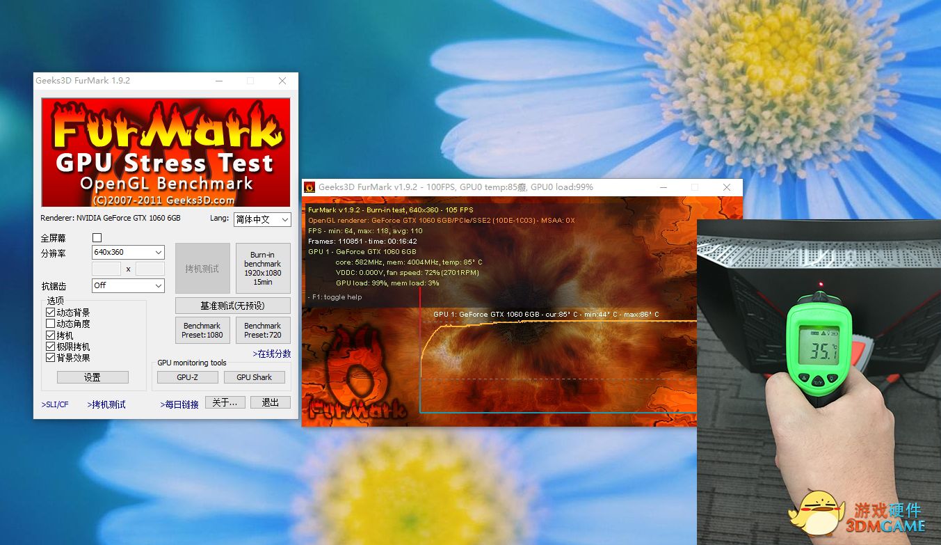 在室温为22度的环境下进行烤机测试,时间为15分钟,使用Furmark(甜甜圈)让显卡满载,测试显卡温度!